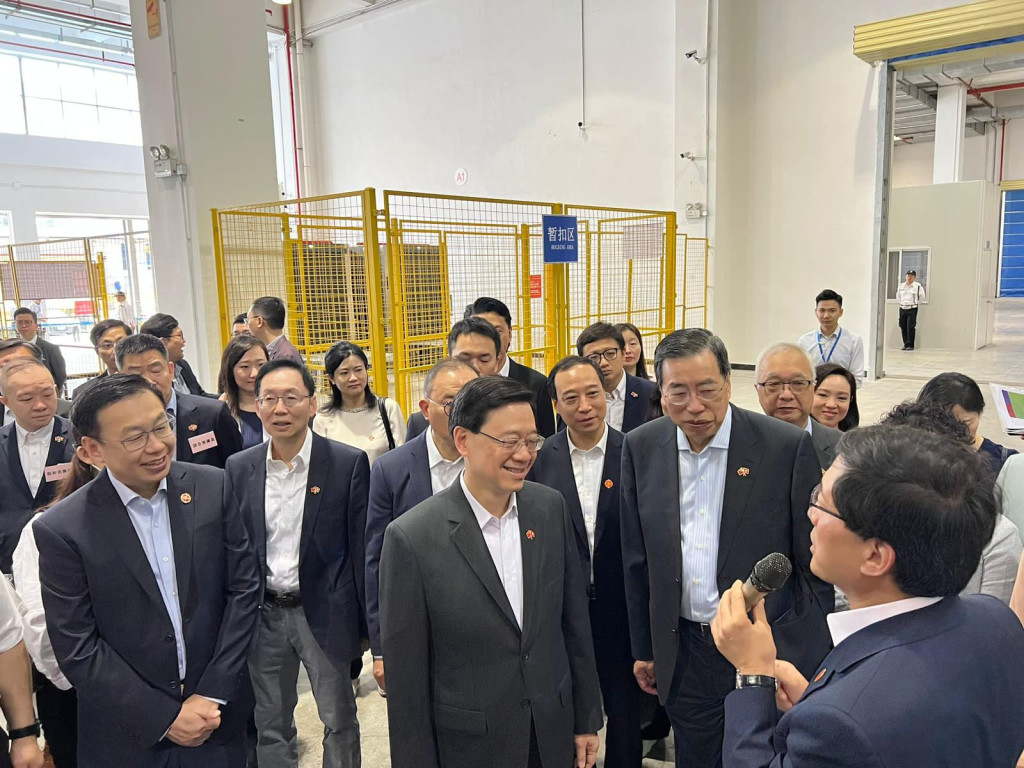 立法会大湾区访问团今日(23日)继续第三日行程。行政长官李家超、环境及生态局局长谢展寰、政制及内地事务局局长曾国卫等官员联同“红组”,今早在东莞参观东莞-香港国际空港中心,其间李家超又慰问在东莞定居的香港安保工作人员,关心他在东莞生活是否安好、习惯。