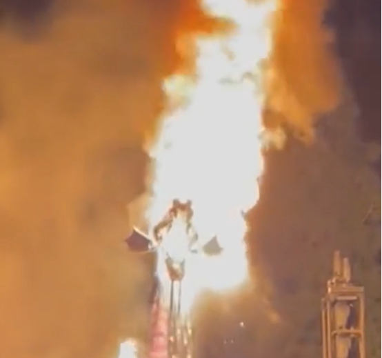 ▲演出期间巨龙头部突然燃烧起来,火光冲天(美国广播公司视频截图)
