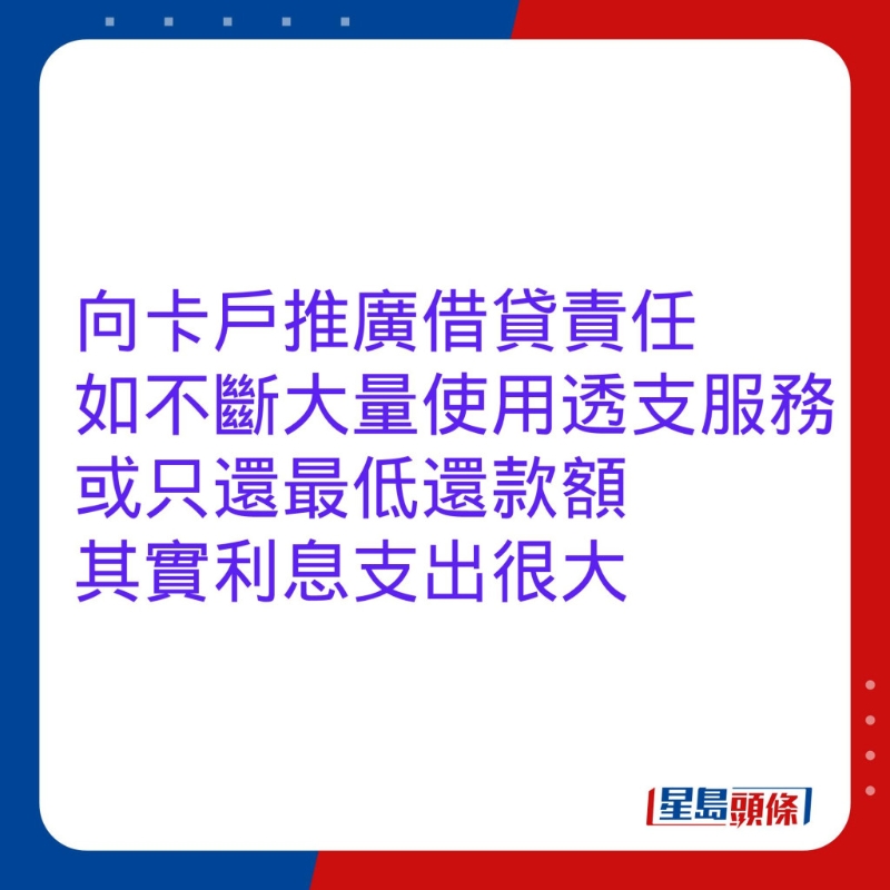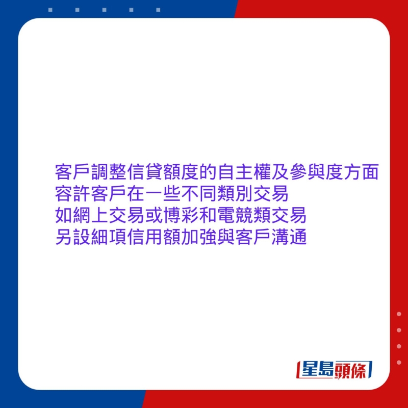 建议的优化范畴亦包括客户在调整信用卡信用额方面的自主权及参与度,局方希望银行容许客户可为一些不同类别的交易另设一个细项信用额(sublimit),例如网上交易,又或博彩、电竞类交易可另设限。