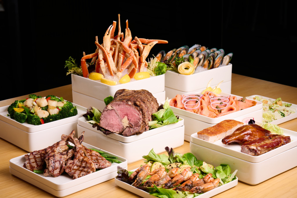 ▲自助餐桌供应源源不绝的时令海鲜、鲜美刺身和手握寿司、顶级中式热荤如燜南非鲍鱼、花胶扣海参、柚皮燴鹅掌、避风塘炒蟹、以及用料十足的鲍鱼花胶椰青炖响螺汤等。