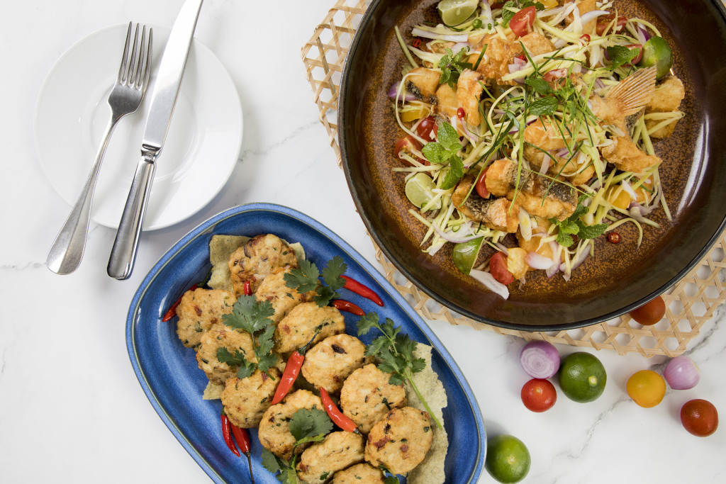▲香港养殖白花鱼泰式青芒果沙律、炸香港养殖黄立鲱炸鱼饼。