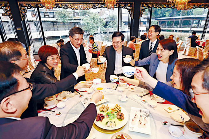 ▲大湾区内地考察旅程最后一天,行政长官李家超和广州市市长郭永航相约到一家具岭南园林特色的粤菜酒家饮早茶。