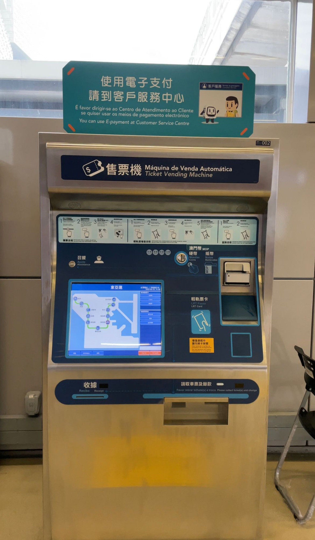 ▲自动售票机购票(澳门币现金或以“轻轨通”付款)