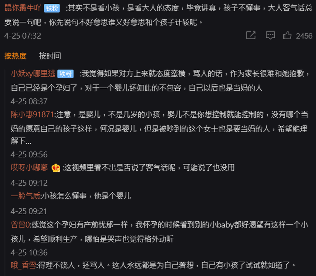 影片曝光后,有网民感叹:BB太小了不懂事,应多点包容与理解,“婴儿真的比较不好哄不好带”;也有网民表示带孩子的父母应在公共场合管好自己的孩子,婴儿哭闹可以到车厢连接处哄,不能因为有婴儿就牺牲掉大家的宁静空间,而且婴儿父母的态度也很重要;也有网民对这名孕妇表示理解,受激素水平影响,孕妇容易情绪激动,要对孕妇多一点宽容;还有网友建议高铁增设母婴室或者儿童车厢。