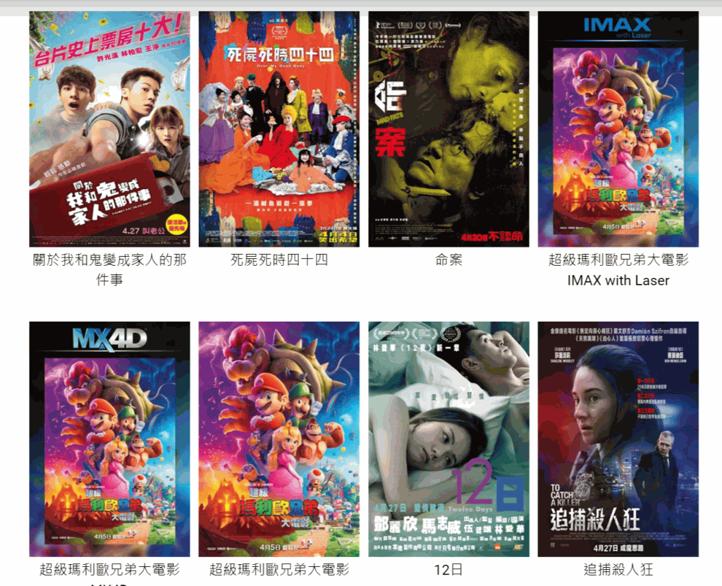 同时包括以下电影格式:4DX、CGS LASER、CGS THX ULTIMATE、D BOX、DOLBY ATMOS、FX、IMAX、IMAX with LASER、LUXE 、1MX4D、ONYX、REAL D CINEMA、SCREEN X 格式。