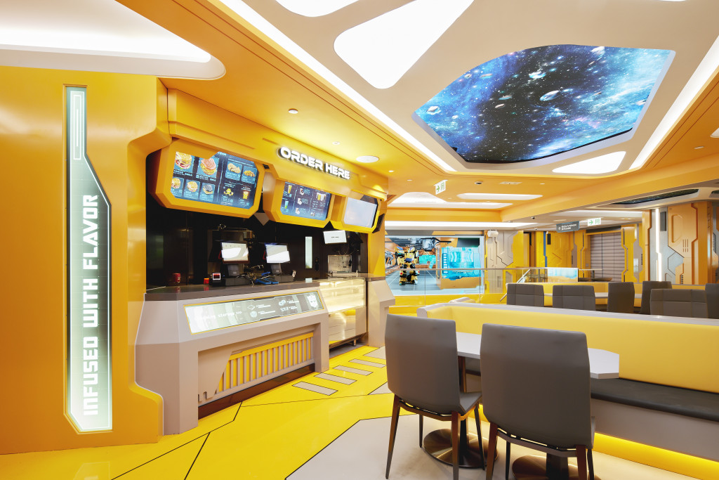 走进如“博派”The Ark太空飞船的餐厅内,内里配合多媒体设备,真实呈现船舱内的环境! 飞船下层内摆放了亚洲首个近3米高的“柯柏文”巨型机动式模型,这个战损版模型更达电影制作级别,各位柯柏文粉丝记住要打卡合照! 登上飞船上层的楼梯,即可朋见到“飞船控制室”,墙身和天花板的订制屏幕更会播放飞船外的太空“实况”,令大家更投入变形金刚世界。 变形金刚角色更会不定期限时快闪出现与客人互动,惊喜处处!