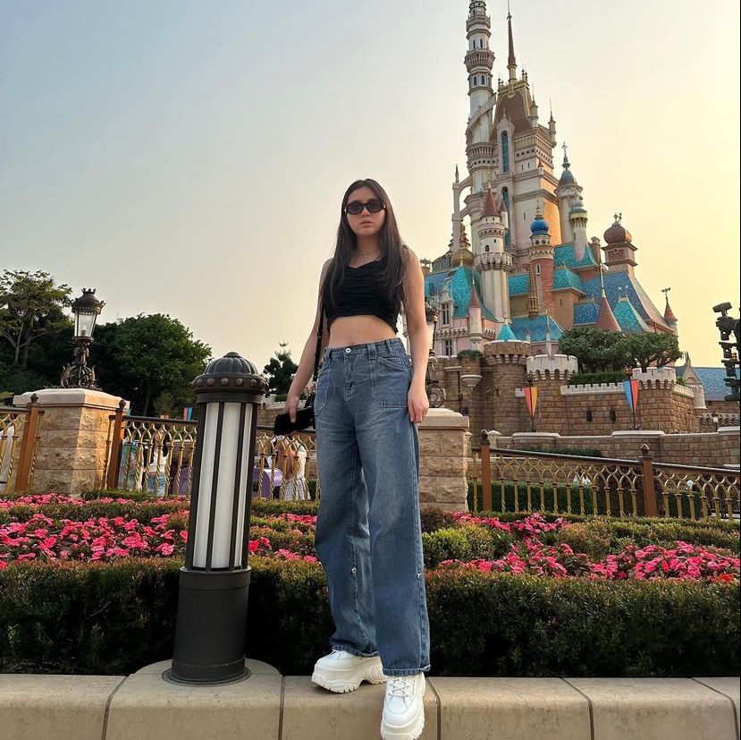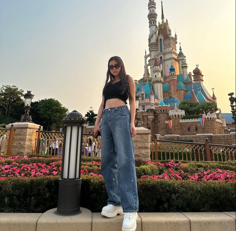 ▲姚焯菲主题乐园城堡前打卡,身形修长!