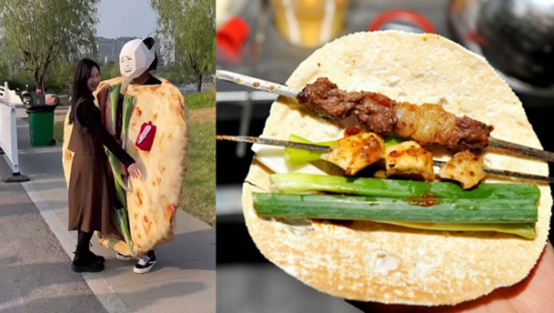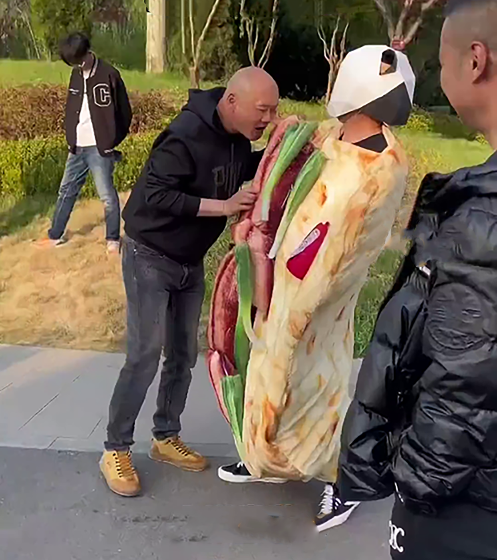 ▲淄博街头出现真人扮的“淄博卷饼”。