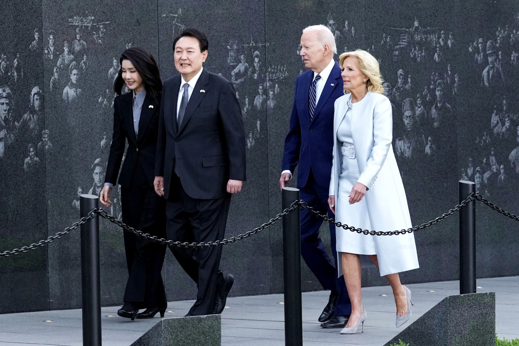▲图为尹锡悦夫妇与拜登夫妇访问位在华府的韩战老兵纪念碑。美联社