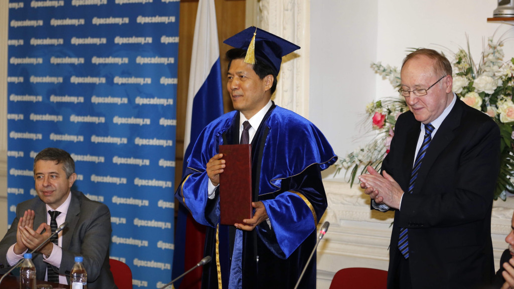 ▲俄罗斯外交部外交学院授予中国驻俄大使李辉荣誉博士称号。 中新社