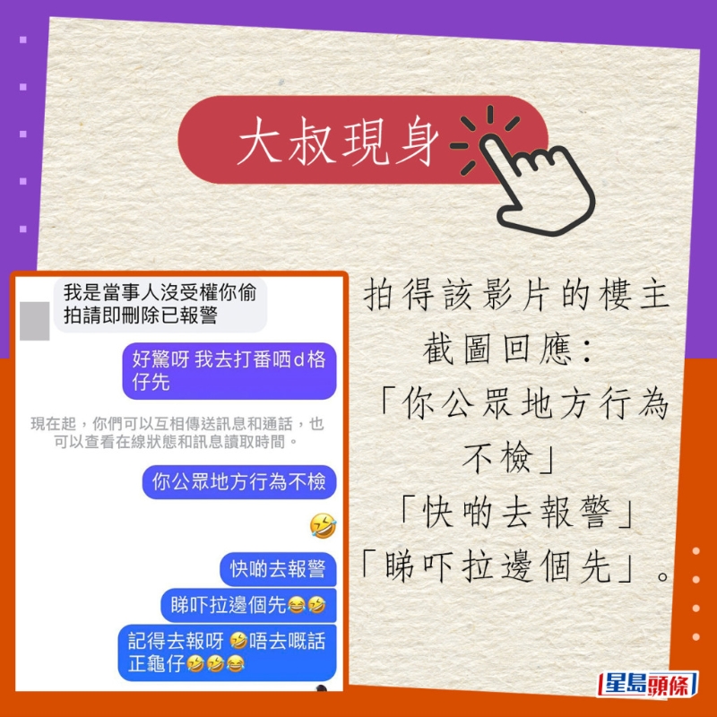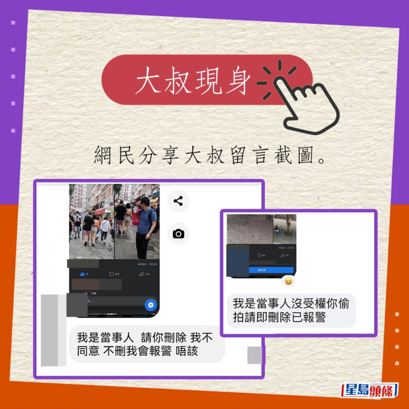 从网民分享的回应截图,大叔对事件有另一番意见。网民其后进行起底,更公开大叔的庐山真面目。