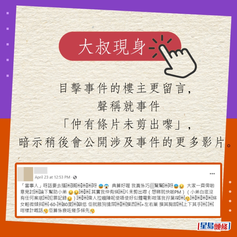目击事件的楼主则留言,声称就事件“仲有(还有)条片未剪出嚟(来)”,暗示稍后会公开涉及事件的更多影片。
