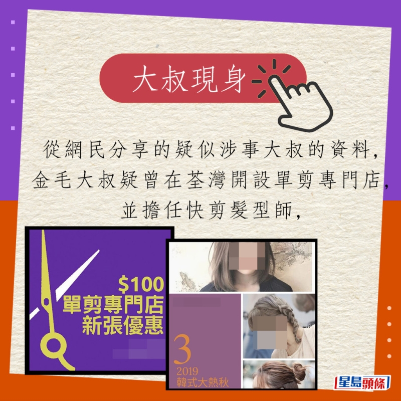 从网民分享的疑似涉事大叔的资料,金毛大叔疑曾在荃湾开设单剪专门店,并担任快剪发型师,记者曾致电该专门店,但电话已停止使用。