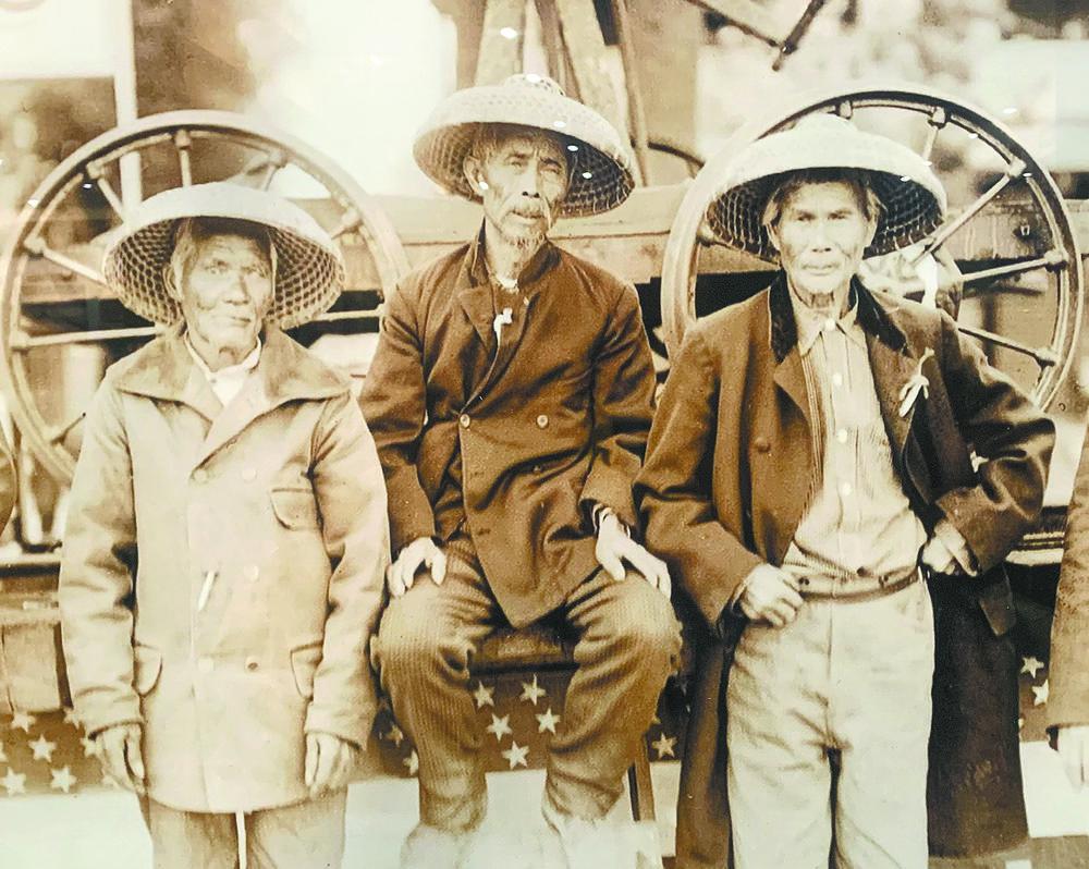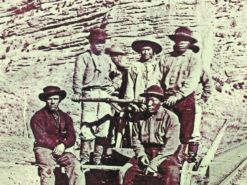 ▲铺设横贯大陆铁路西段最后铁轨的其中三名华工。
