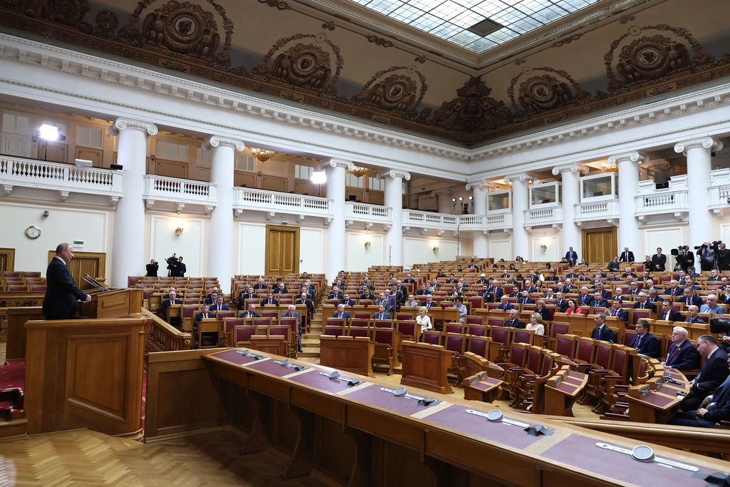 ▲普京在俄罗斯国家杜马立法委员会发表讲话。美联社