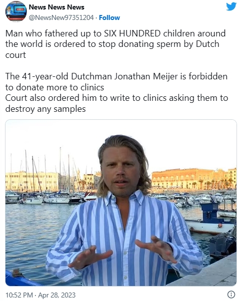《荷兰时报》(NL Times)报导,非营利组织Stichting Donorkind基金会日前向法院递状要求禁止41岁男子强纳森M(Jonathan M.)捐精。路透社报导,此人的姓氏是梅尔(Jonathan Meijer),2017年荷兰妇产科医学会就示警要注意此人,当时他因已在荷兰10家诊所捐精生下102名子女而遭禁止捐精,此后他转往海外“发展”。法新社指他2007年开始捐精,至今已是550至600个孩子的“生父”。