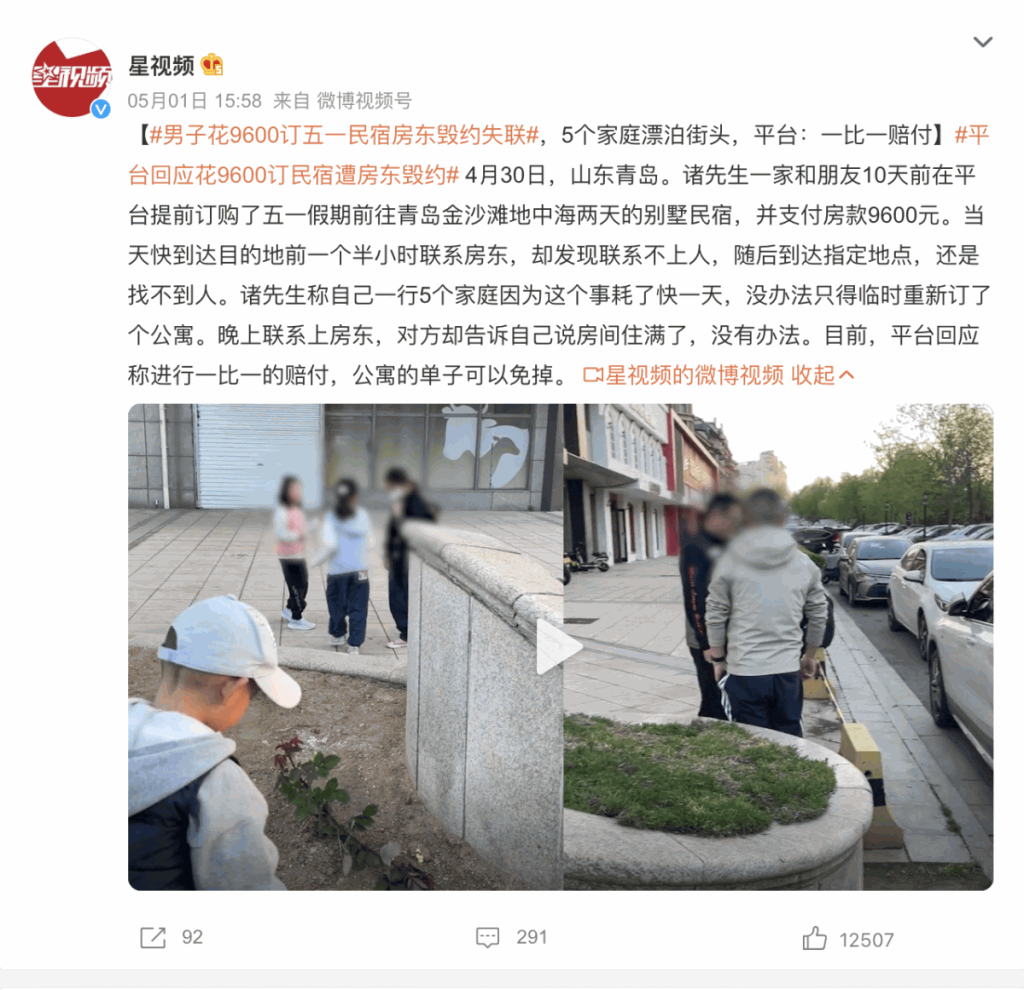 在山东青岛,诸先生一家和朋友10天前在平台提前订购了五一假期前往青岛金沙滩地中海两天的别墅民宿,并支付房款9600元(人民币,下同)。当天快到达目的地前一个半小时联系房东,却发现联系不上人,随后到达指定地点,还是找不到人。