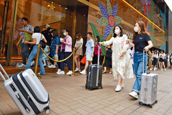 ▲广东道的名牌店外昨日有不少旅客排长队,排队等候入内购物。