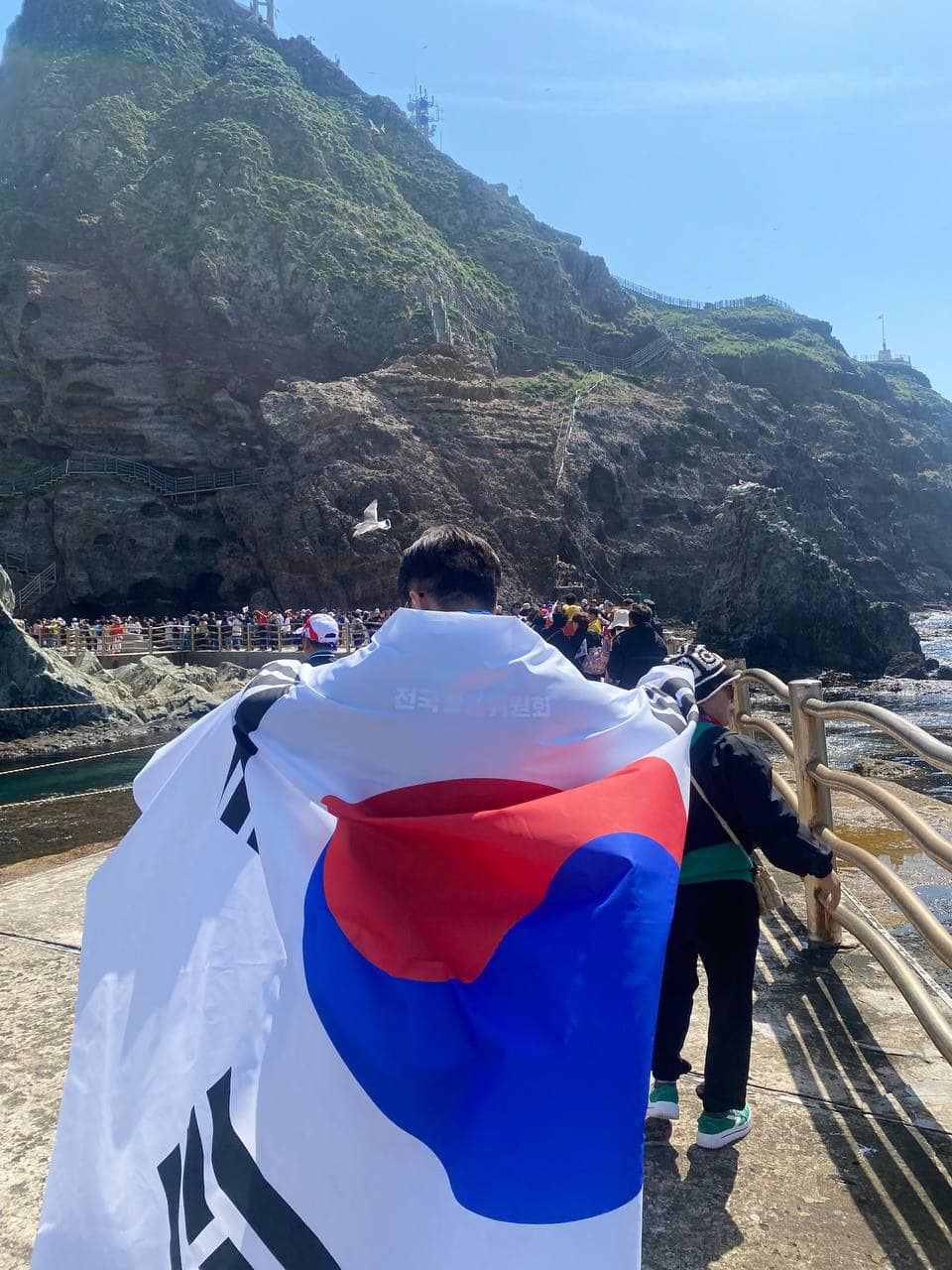 ▲田溶冀披上韩国国旗与10多名同党青年成员登上独岛。 fb