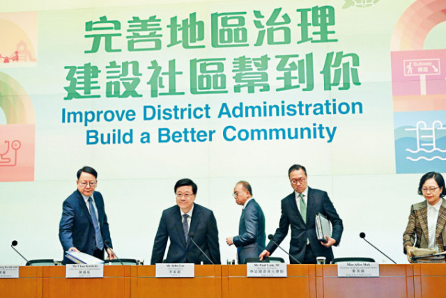 李家超提到,国家主席习近平去年七一讲话提出“四点希望”,当中首要是“提高治理水平”,在治理工作上,特区政府层面与地区层面息息相关,这次的完善地区治理建议方案,既包含重塑区议会,也包括强化地区治理架构,强调政府政策一定要“落地”,又指政府层面与地区层面息息相关,因为政府推出的任何政策最终都要令市民受惠。