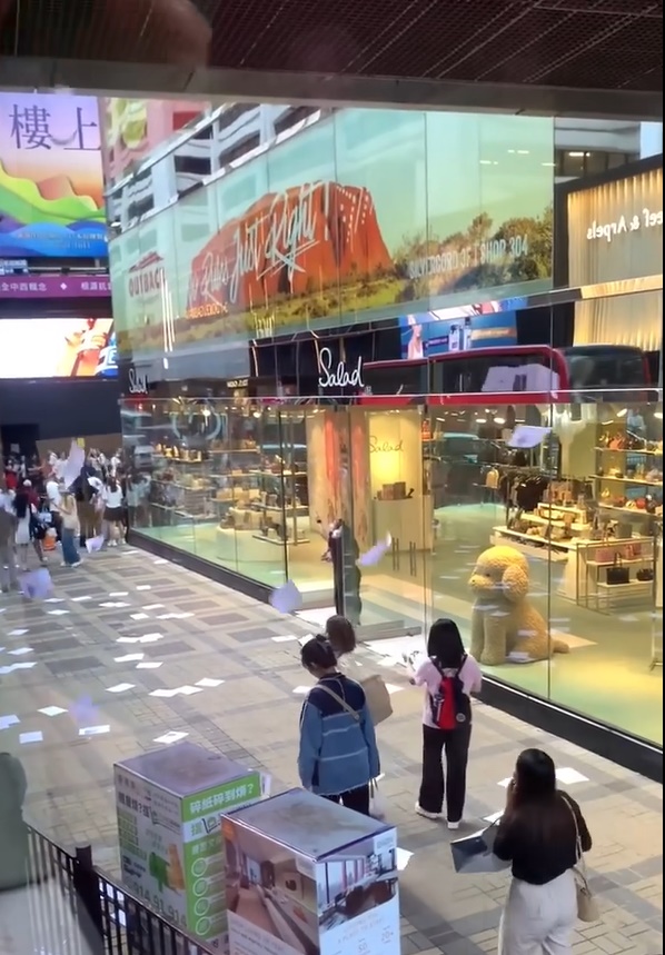 ▲尖沙嘴广东道怀疑有人从高处撒下大批传单,一瞬间如飘雪般浪漫。网上截图