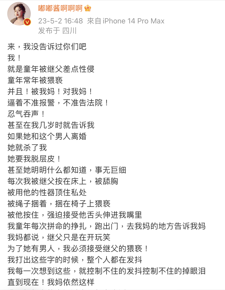 ▲“嘟嘟酱啊啊啊”5月2日发文自爆童年遭继父猥亵,差点被性侵。 微博截图