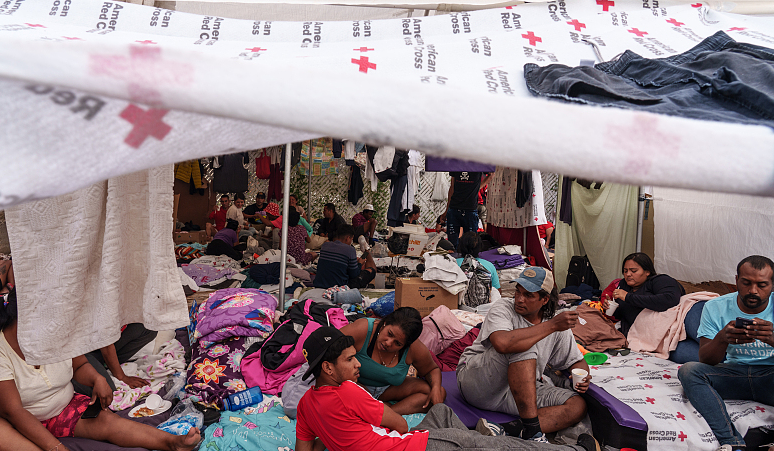 ▲美国得克萨斯州,移民们在无家可归者中心前扎营。