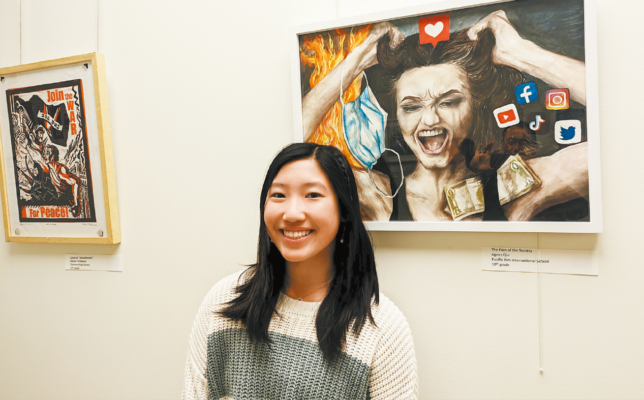 ▲华裔学生邱子倩(Agnes Qiu)与其获奖画作“The Pain of the Society”。 受访者提供