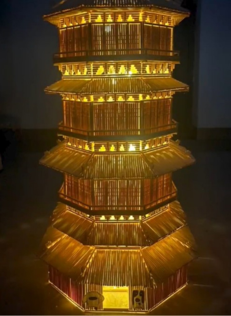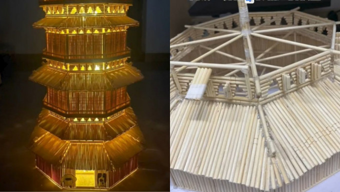 内地传媒报道,在近日,江西赣州一名男大学生,经计算和准备,耗时1月用了1100根筷子建成了一座筷子“宝塔”。不单外形美轮美奂,内部结构也一丝不苟,根据力学计算,最先在搭内搭建的一个筷子架地基,支撑着整座“宝塔”矗立不倒,然后再上色,于内部装上电灯,令整座塔发光,精致度俨如一座艺术品。