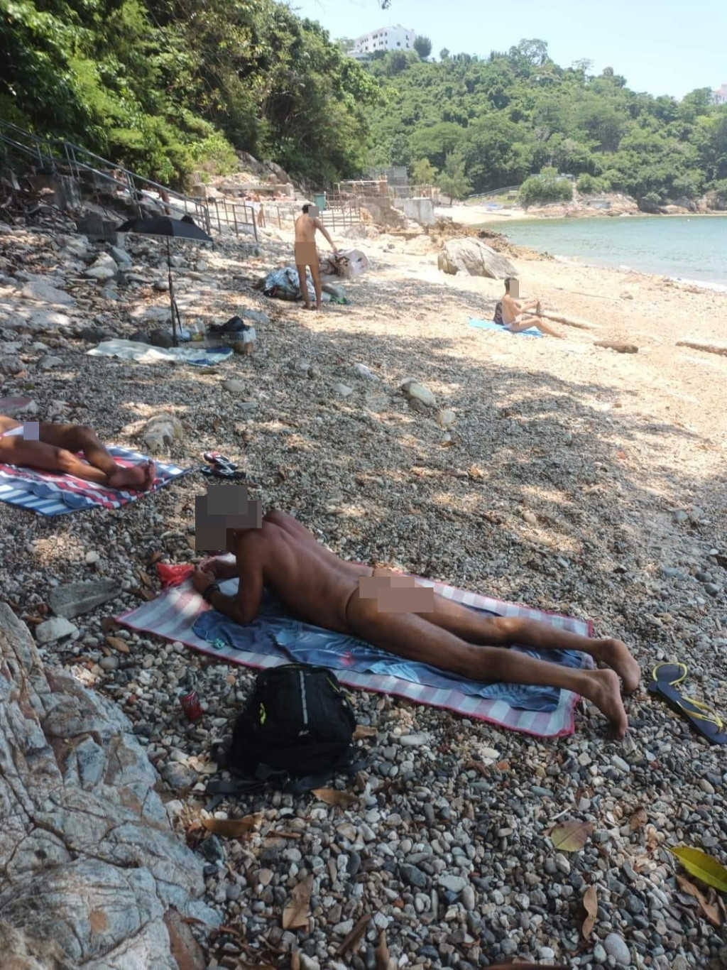 其中一张相片,拍摄到一名穿胶鞋,怀疑见到八月十五的男子站于沙滩石级旁,手持一个载有水的半透明胶水桶。另一张相内容丰富,近镜拍摄到一名反身躺着,疑仅穿t-back的男泳客,不远处有一名躺着穿白色三角泳裤的男子;在远处的可见范围,还有一名从背后看,怀疑无穿泳裤的男子站着。