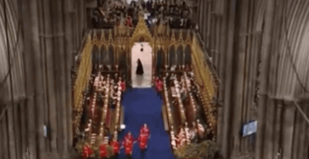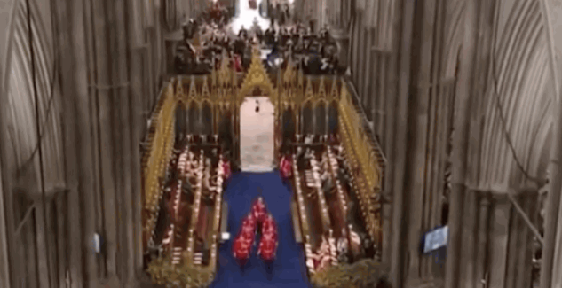 ▲加冕仪式开始前,王室士兵步操进入西敏寺教堂。