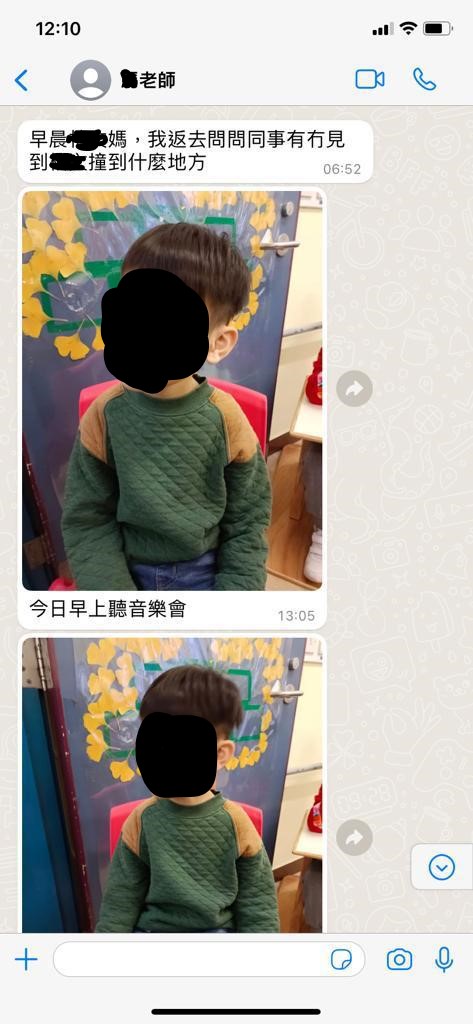 ▲陈妈妈发现儿子受伤后即时透过讯息向班主任查问,班主任其后传了两张其子早上听音乐会的照片给陈妈妈,说明他昨早表现没有异样。