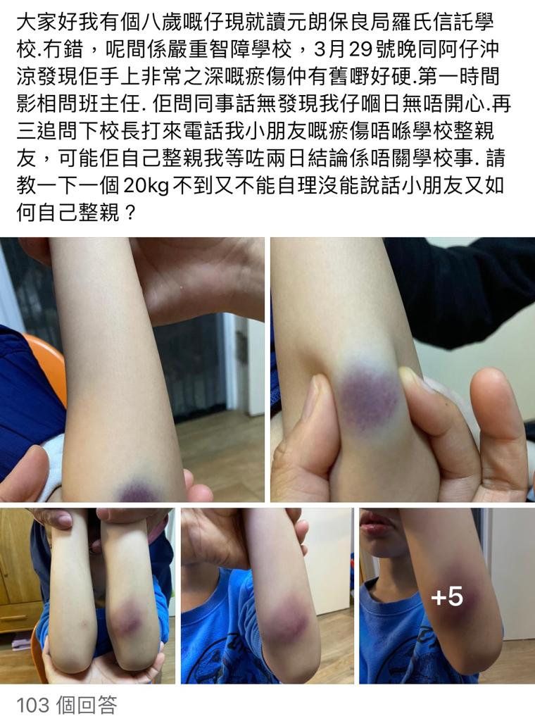 据陈妈妈所讲,儿子就读元朗的保良局罗氏信托学校,该校是一所为适龄严重智障儿童提供教育的特殊学校。贤仔去年9月入读该校,一直相安无事,直到3月底发现儿子手上有大片瘀伤:“晚上帮他洗澡时,他手上有个很深瘀痕,伤痕下有嚿嘢好硬,五蚊银咁大。”