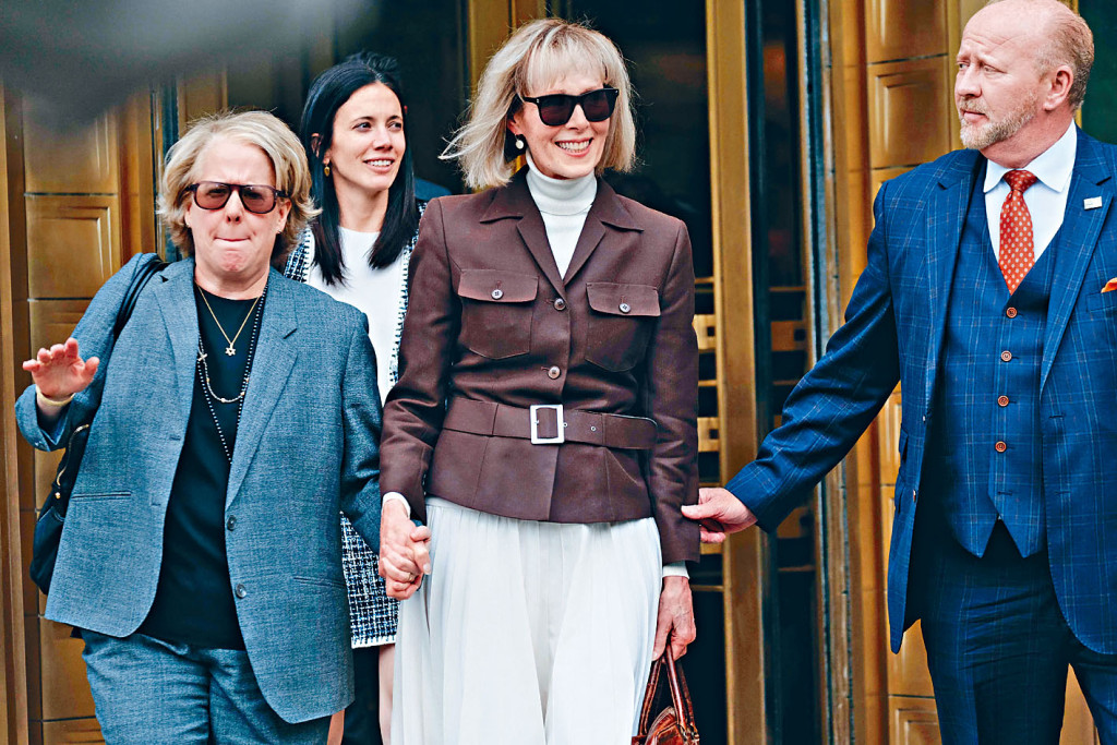 ▲曼克顿法院周二裁定特朗普性侵和诽谤罪成后,女作家卡罗尔(中)面带笑容离开。