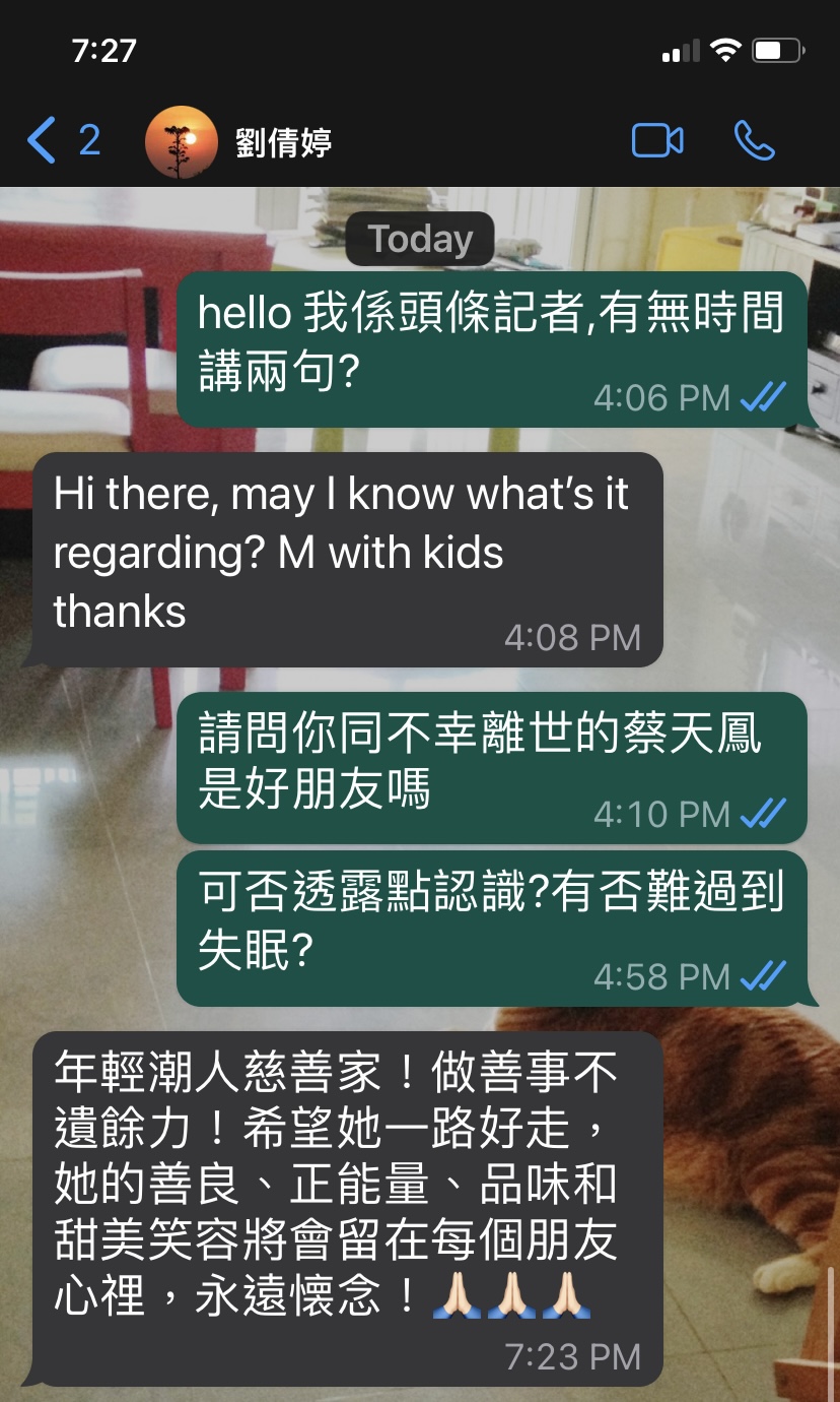 ▲刘倩婷在得知好友死讯后,曾以短讯回复记者,会永远怀念这位好朋友。