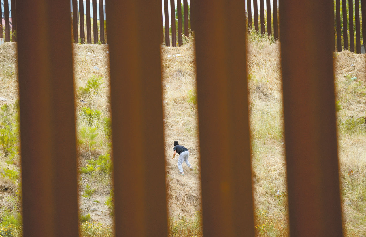 ▲国安部官员表示,“42条款”正式失效后首天,美墨边境未如预期般出现移民潮。 图为在圣地亚哥边界墙之间,一个男孩爬上山坡寻求入境。 美联社