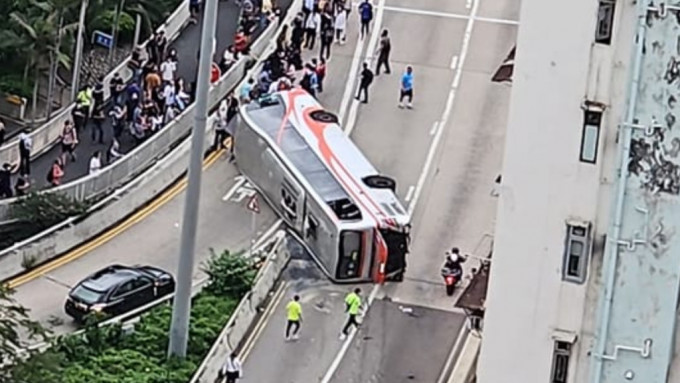▲荃湾德士古道旅巴翻侧 23乘客受伤司机昏迷。网上图片