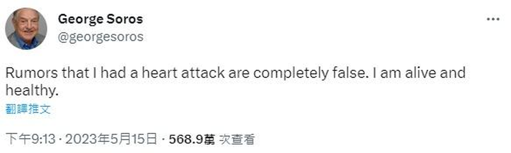 对此,索罗斯本人终于忍不住,在超过12小时后于Twitter辟谣,“谣言说我心脏病发作离世,完全是错的。我还活着,而且很健康。“索罗斯的发言人也于15日告诉路透社,索罗斯本人没事,社交平台上的只是谣言。