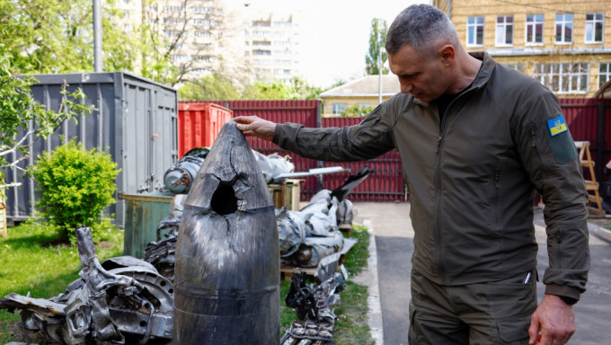 ▲基辅市长克里奇科(Vitali Klitschko)晒“匕首”残骸,但专家认为弹头大小不对,若是真的“匕首”弹头应比人高。路透社