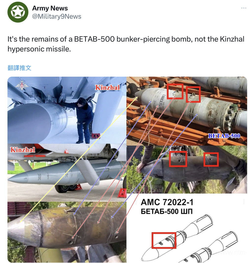 基辅市长克里奇科与“匕首”残骸合影,眼尖的网友发现,“匕首”导弹全长8米,战斗部为3米,即便是彪型大汉如克里奇科,弹头也必定比他还要高,但照片中的弹头残骸高度只到他胸前。弹头直径也不对,小了好几圈。军事专家指出,克里奇科晒出的残骸,其实是BETAB-500碉堡克星炸弹,是专门用来攻击地下水泥工事的钻地弹。