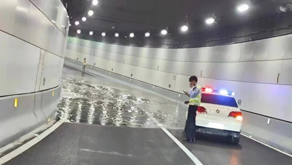 ▲大连湾海底隧道通车半个月惊传漏水,路面可见积水。