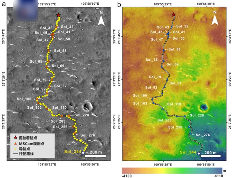 自着陆以来,“祝融号”一直在向南驶向潜在的海岸线区域,并对沿途出露的北方荒原组地层展开观测。 “祝融号”行驶了约1921米,使用不同的成像和分析系统对露头和地表岩石进行详细的就位观测,其中导航和地形相机已经获得了106组全景图像,详细记录了“祝融号”行进路线附近许多岩石的表面形态与构造特征。
