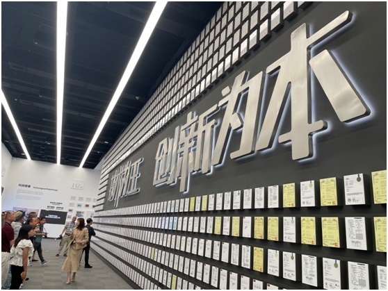 ▲海外华媒代表团成员参观比亚迪的专利墙。