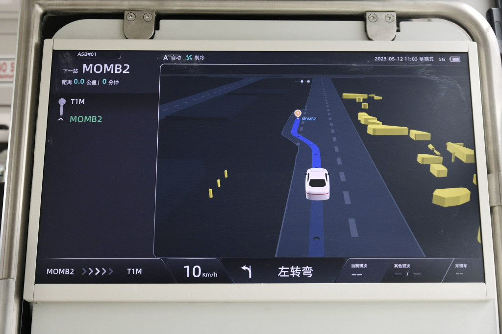 ▲香港首部无人驾驶巴士(比亚迪纯电动无人驾驶巴士)于2023年5月15日在机场禁区投入运作、每日行驶12小时、接载机场员工来往机场各处。 图为车内配备大屏幕,显示行车路线等信息。