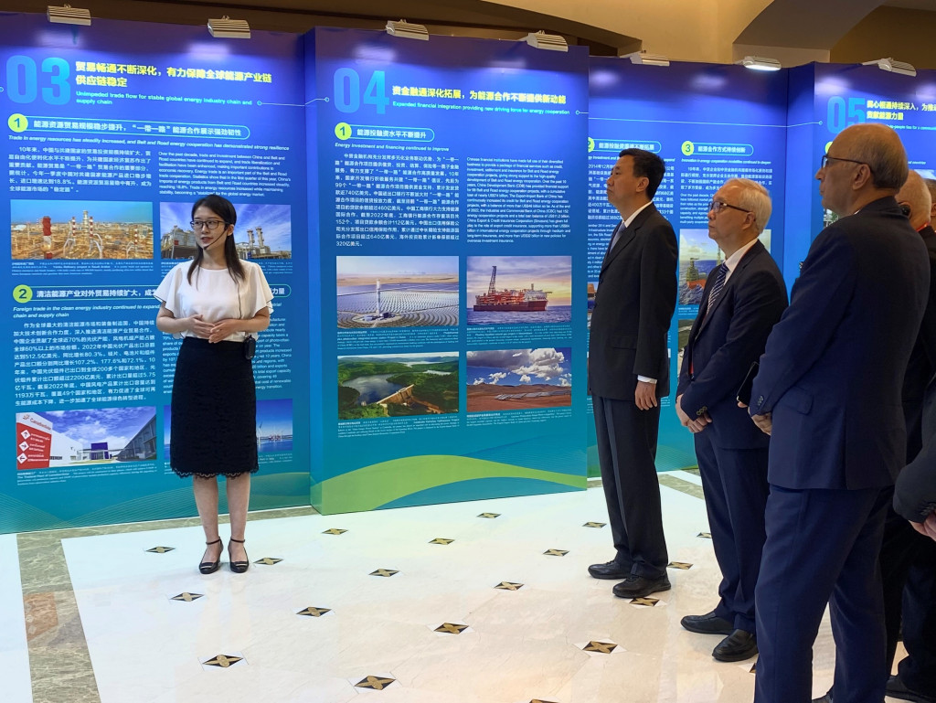 ▲谢展寰(右二)与国家能源局副局长任京东(右三),以及其他国家代表一同参观会场特设的“一带一路”能源合作十周年主题展览。(政府新闻处)