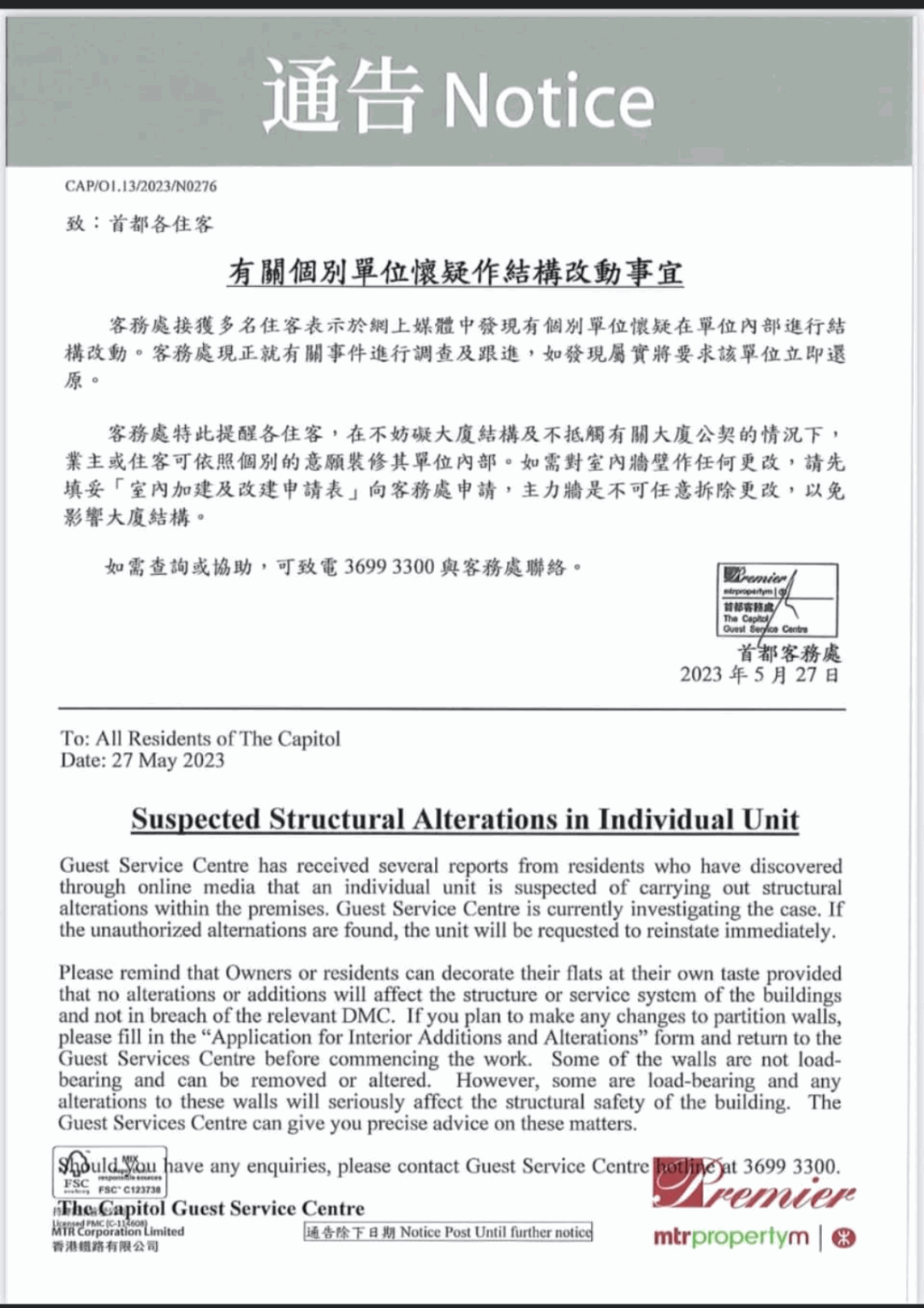 近日将军澳日出康城首都有业主装修期间,拆走单位墙壁。事后有“睇楼”网站拍摄单位,期间亦有相信是单位设计师男子,在片中现身简介成品。然而片段播出,有眼利网民发现图则上一幅被改动墙壁,怀疑是楼宇主力墙,引起居民担忧。当区区议员方国珊表示,目前仍在求证事件,已责成屋苑客务处彻查。