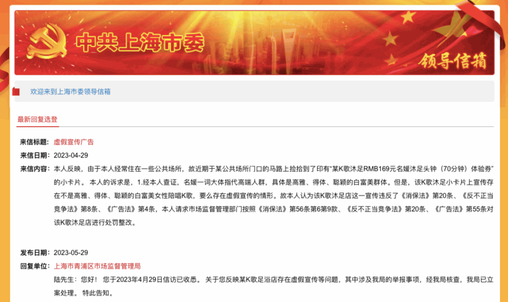 上海市青浦区市场监督管理局回应,关于您反映某这一足浴店存在虚假宣传等问题,其中涉及当局的举报事项,经局方核查,已立案处理。