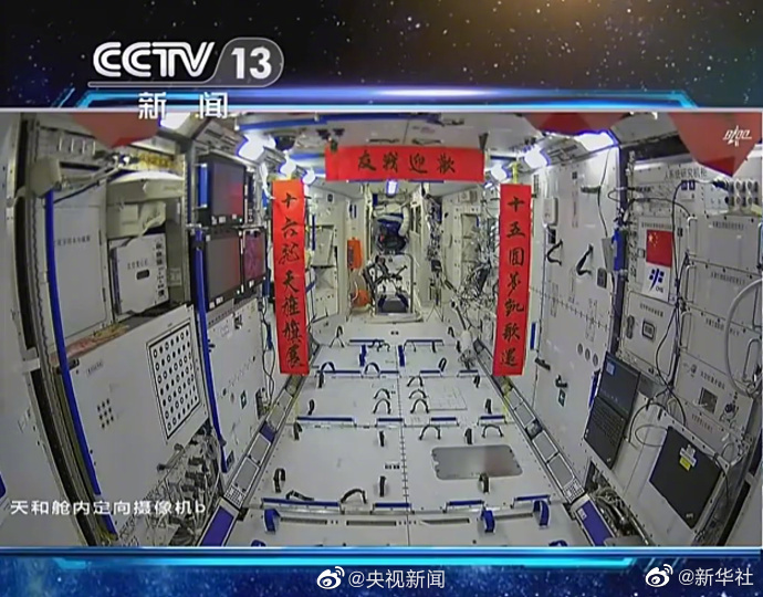▲天和舱挂起欢迎神舟十六号太空人的字句。央视