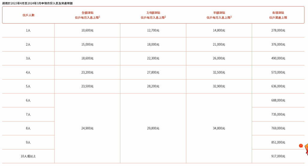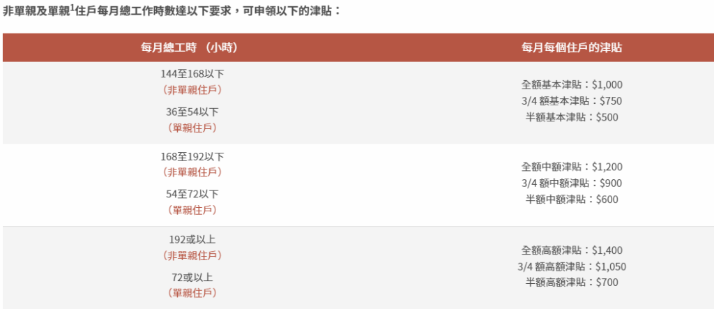 在职家庭津贴为了鼓励自力更生,纾缓跨代贫穷,符合相关入息及资产等要求的申请住户(包括1人住户)可以根据每月工时获得相应津贴资助。以1人非单亲住户为例,每月收入低于10,600元,资产278,000以下的申请者每月总工时达192小时或以上即可领取$1,400的全额津贴。其他合资格申请者可参照图片了解相关入息及津贴。