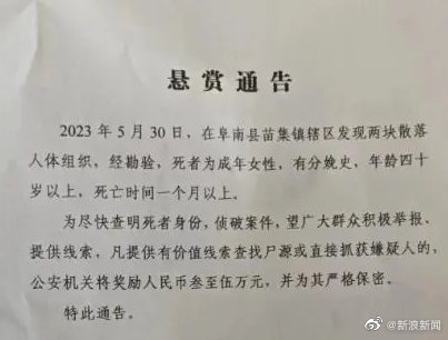 安徽阜南县公安局6月1日发出悬赏通告,称警方发现了两块“人体组织”,死者为一名40岁以上的成年女性,悬赏人民币3至5万元,希望民众能提供线索。